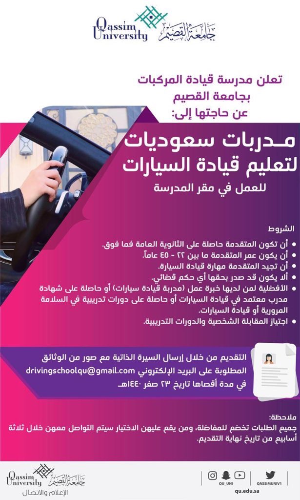 مهند وظائف القصيم Na Twitteri تعلن جامعة القصيم عن حاجتها إلى مدربات قيادة سيارات للعمل في مقر المدرسة بـ القصيم ممن تنطبق عليهم الشروط المعلنة للتقديم من خلال إرسال السيرة الذاتية عبر