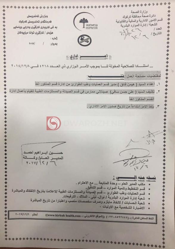 Kurdipedia اعفاء السيد هيمن فتق مدير قسم العمليات وطب الطواري من ادارة قسم المذكور