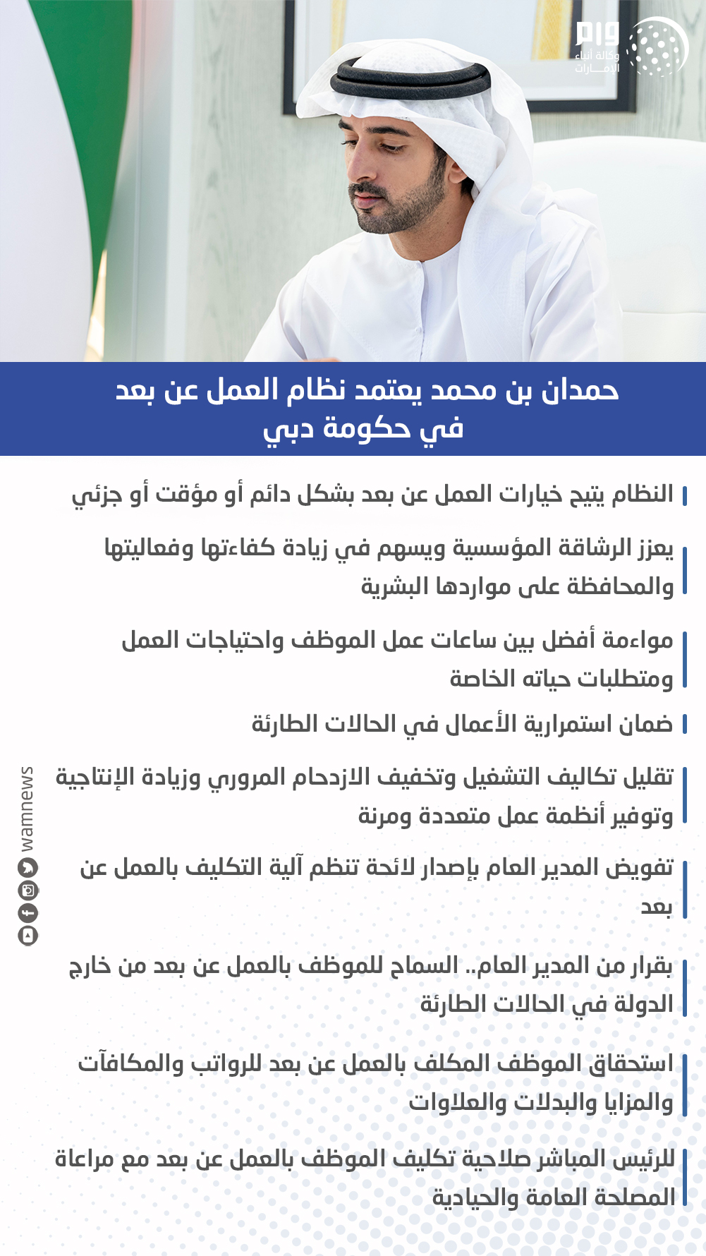 وكالة أنباء الإمارات حمدان بن محمد يعتمد نظام العمل عن ب عد في حكومة دبي وام للتفاصيل