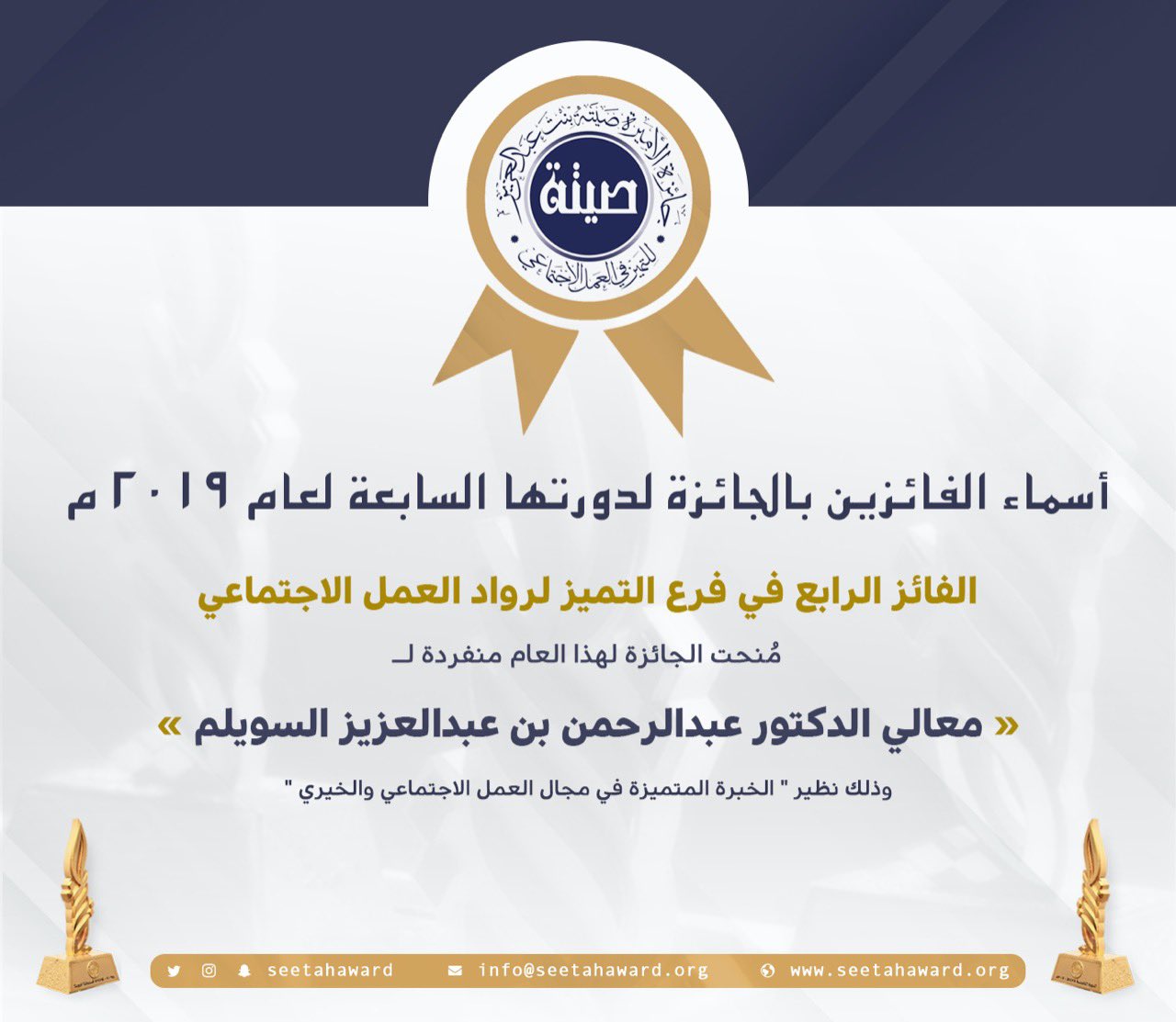 جائزة الأميرة صيتة On Twitter المغلوث الفائز في فرع التميز لرواد العمل الاجتماعي معالي الدكتور عبدالرحمن بن عبدالعزيز السويلم جائزة الأميرة صيتة صيت صيتة Https T Co Jzpa5poxda