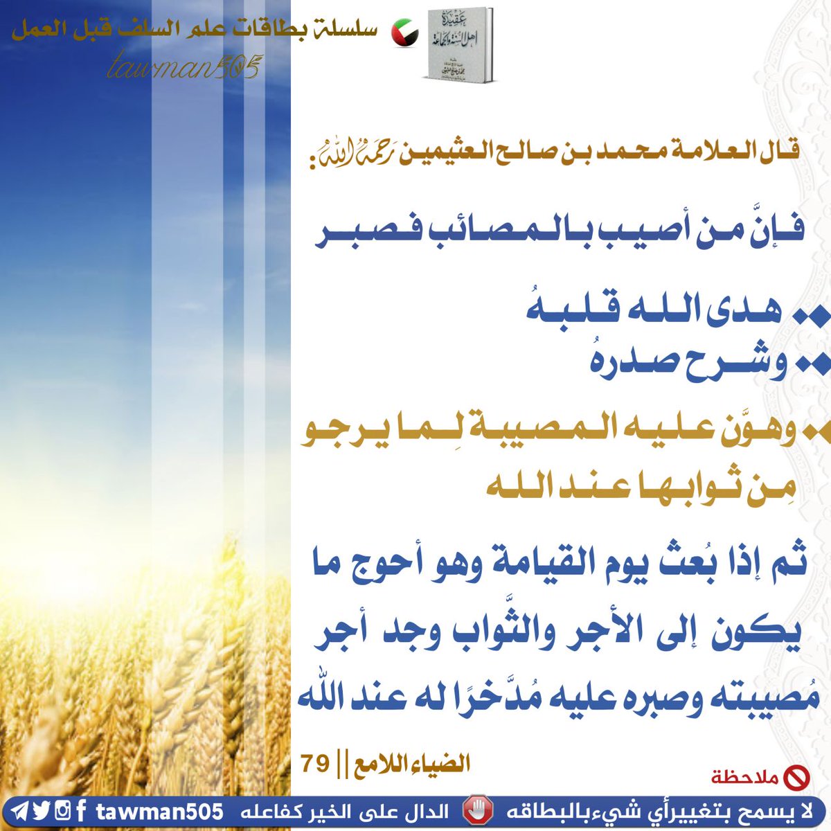علم السلف قبل العمل على تويتر قال ابن عثيمين فإن من أصيب بالمصائب فصبر هدى الله قلبه وشرح صدره وهون عليه المصيبة ل ما يرجو م ن ثوابها عند الله ثم إذا
