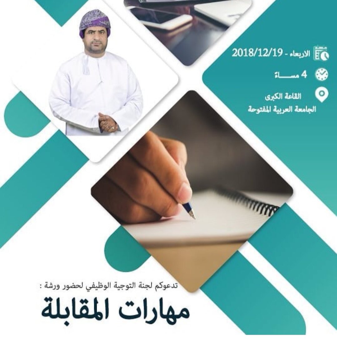 مسار Ar Twitter لجنة التوجيه الوظيفي بالجامعة العربية المفتوحة تدعوكم لحضور ورشة مهارات المقابلة الزمان الأربعاء ١٩ ديسمبر ٢٠١٨ التوقيت ٤ مساء المكان الجامعة العربية المفتوحة مدينة السلطان قابوس