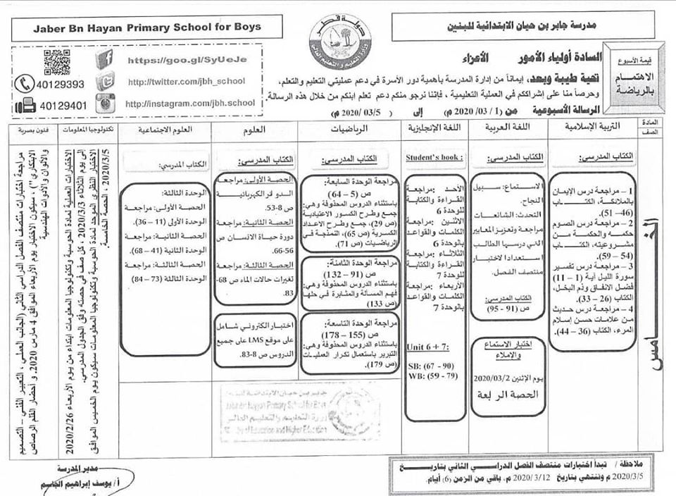 Jaber Ben Hayan On Twitter الرسالة الأسبوعية من 1 3 2020 إلى 5 3 2020 للصف الخامس Qatar Edu Qatar Edu