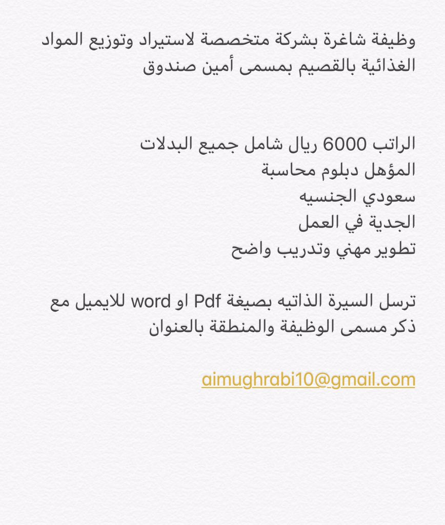 مهند وظائف القصيم On Twitter وظيفة رجالية شاغرة بشركة متخصصة لاستيراد وتوزيع المواد الغذائية بالقصيم بمسمى أمين صندوق الراتب 6000 ريال المؤهل دبلوم محاسبة سعودي الجنسيه الجدية في العمل ترسل السيرة الذاتيه بصيغة