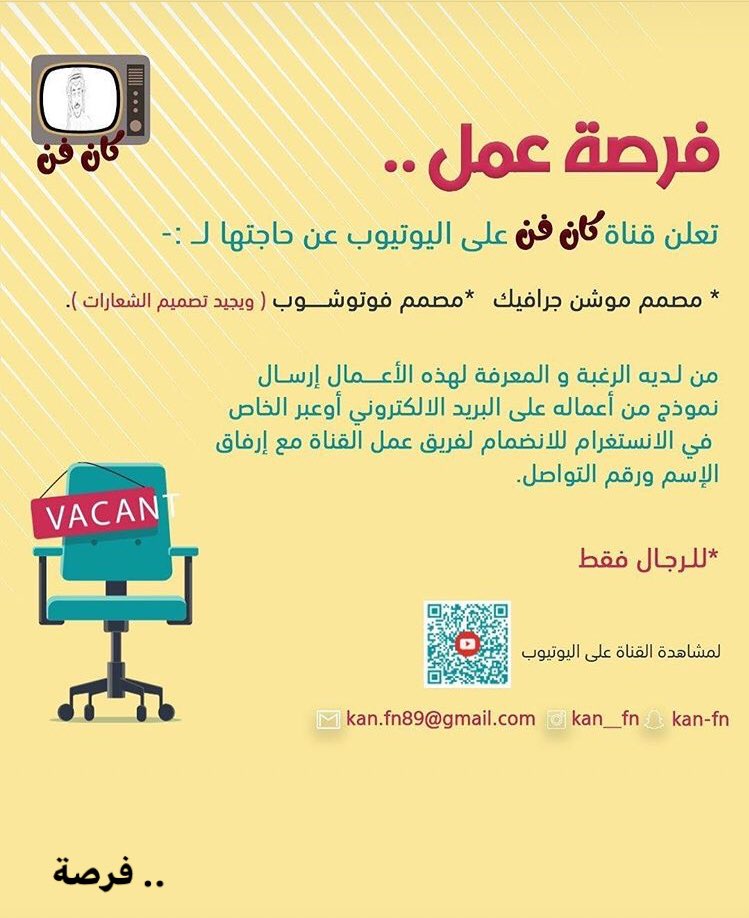 مسار A Twitter فرصة عمل في قناة كان فن على اليوتيوب ١ مصمم موشن جرافيك ٢ مصمم فوتوشوب ارسل أعمالك الى البريد الموضح في الاعلان
