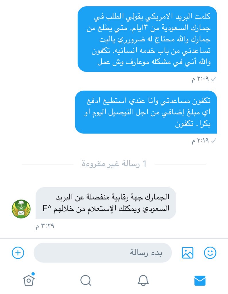 الجمارك السعودية A Twitter مرحبا بك الشركة الناقلة هي المسؤولة عن إفادتك بكافة التفاصيل المتعلقة بالشحنة الخاصة بك نسعد بخدمتك