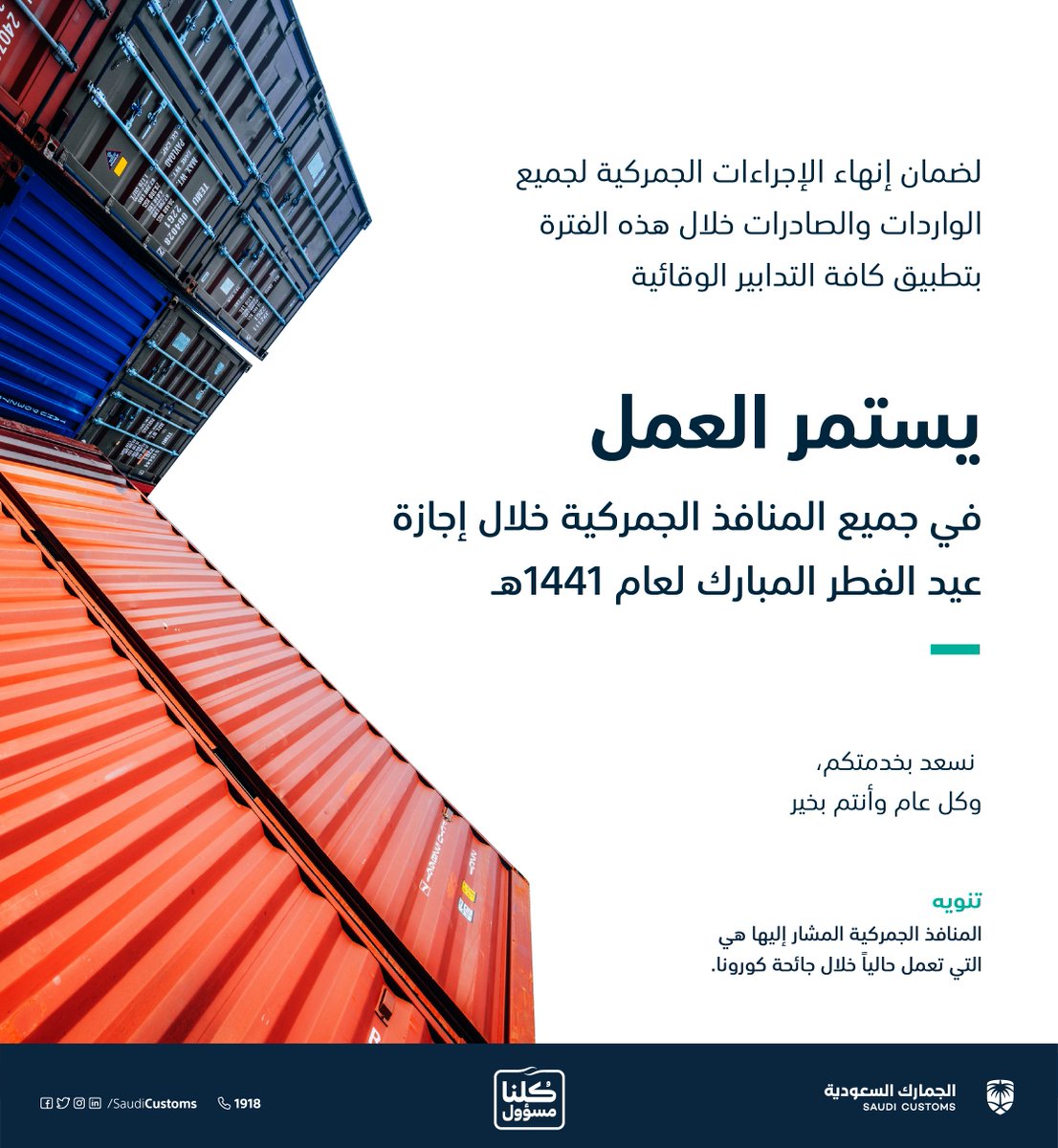 الجمارك السعودية On Twitter تستمر الجمارك السعودية في العمل عبر جميع المنافذ الجمركية خلال أيام عيد الفطر المبارك وكل عام وأنتم بخير