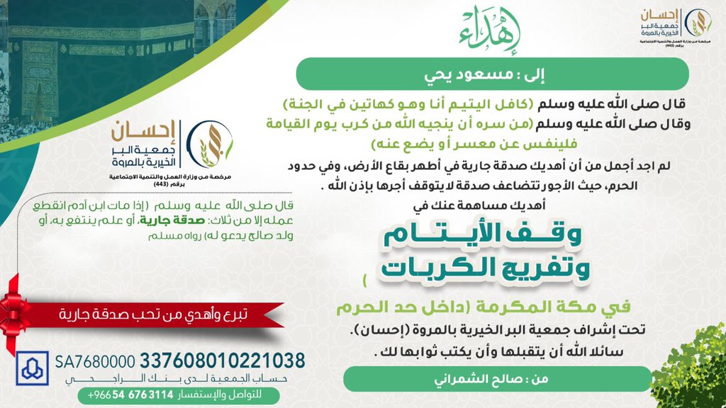 وقف الوالدين بمكة Twitterissa لتابع لجمعية البر الخيرية بابي عريش مرخص من وزارة العمل والتنمية الاجتماعية برقم 134 الراجحي Sa0580000 225608010222775 لنكمل وقف الوالدين بمكه اجر دائم وبر لا ينقطع للمزيد Https T Co 8xt8veveya Https T Co