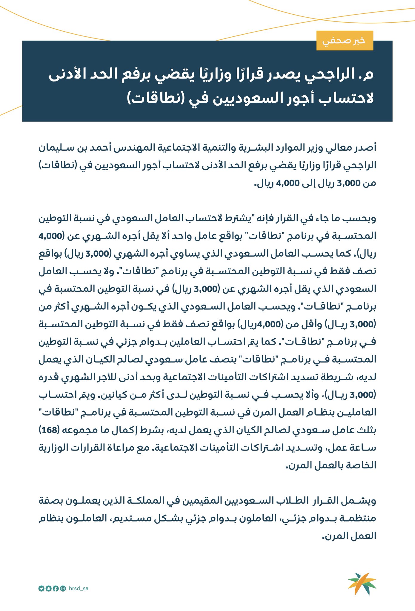وزارة الموارد البشرية والتنمية الاجتماعية On Twitter م الراجحي يصدر قرار ا وزاري ا يقضي برفع الحد الأدنى لاحتساب أجور السعوديين في نطاقات
