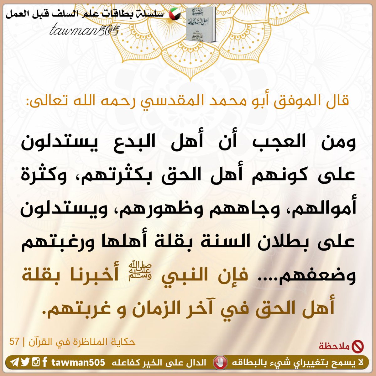 علم السلف قبل العمل On Twitter قال الموفق أبو محمد المقدسي ومن العجب أن أهل البدع يستدلون على كونهم أهل الحق بكثرتهم وكثرة أموالهم وجاههم وظهورهم ويستدلون على بطلان السنة بقلة أهلها
