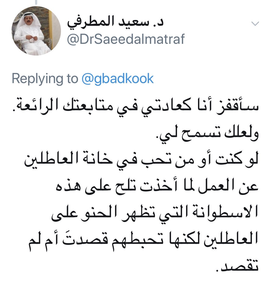 غسان بادكوك Pa Twitter سبق وأن ناقشنا ذلك كثيرا يا دكتور لديك تصو را مغلوطا عن التوطين والسعودة والعمل المهني لن أجادلك هذه المرة وأترك الحكم على رأيك للمغردين مع التقدير لكافة الآراء