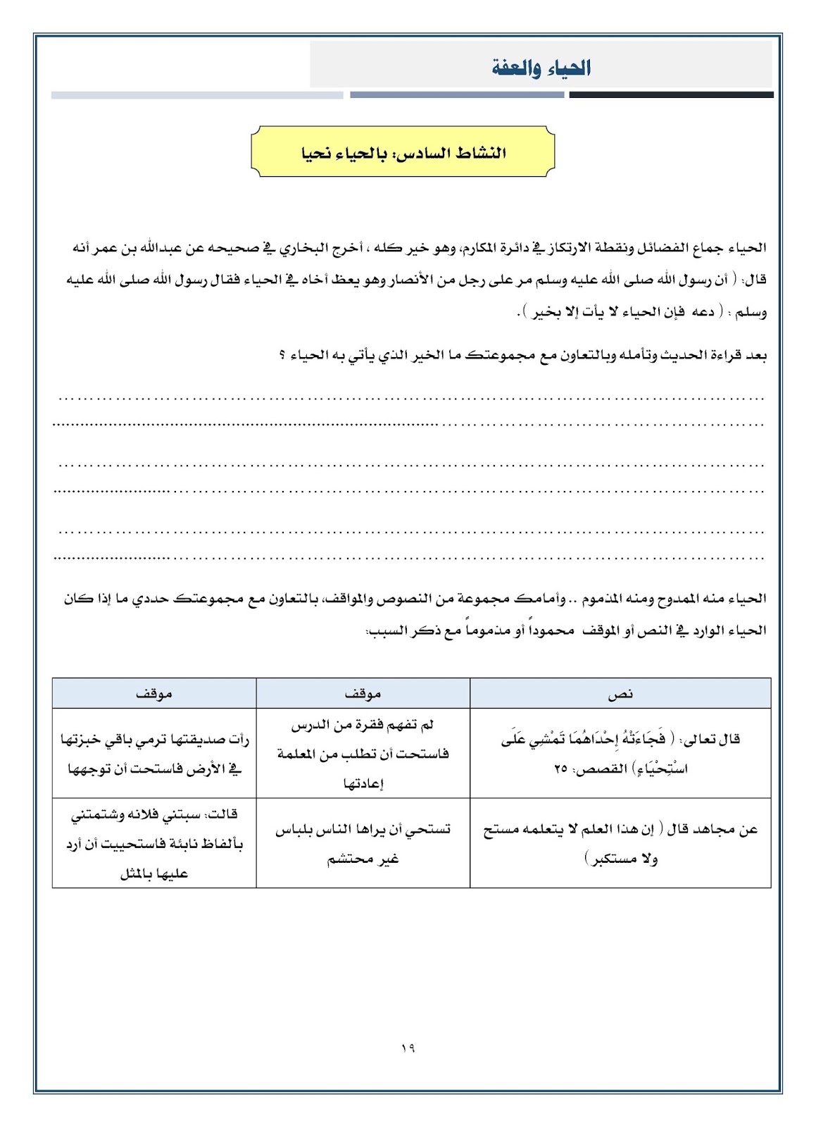الحياء والعفة النشاط السادس بالحياء نحيا ورقة عمل مع الحل