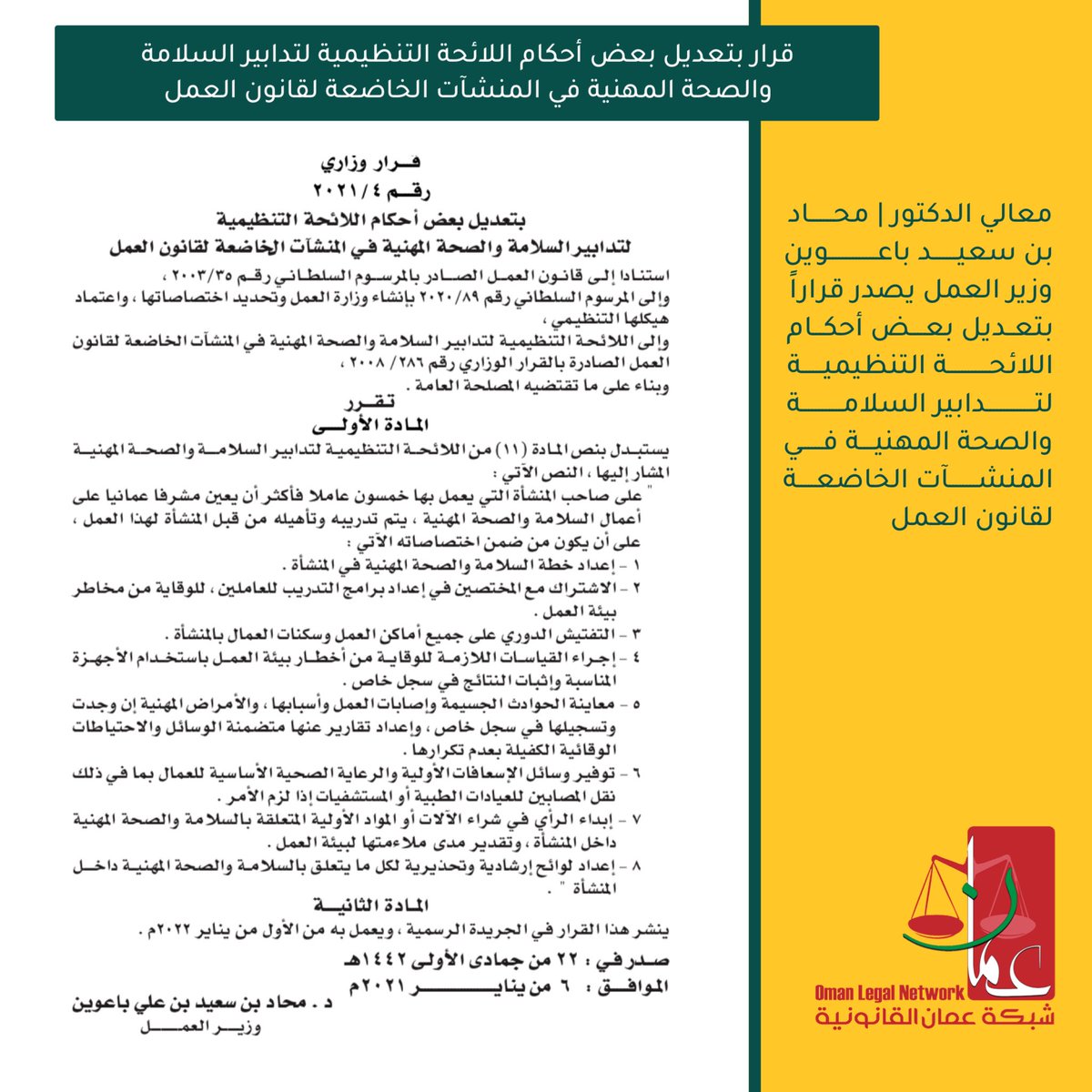 شبكة عمان القانونية On Twitter معالي الدكتور محاد بن سعيد باعوين وزير العمل يصدر قرارا بتعديل بعض أحكام اللائحة التنظيمية لتدابير السلامة والصحة المهنية في المنشآت الخاضعة لقانون العمل شبكة عمان القانونية