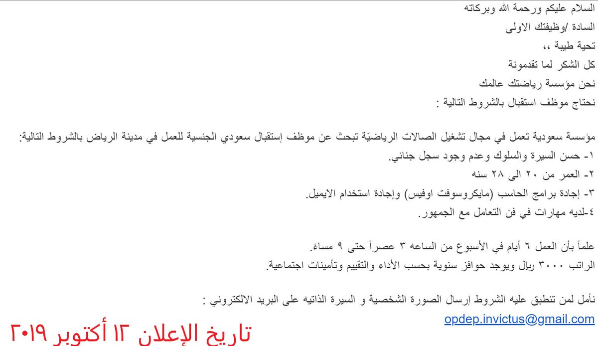 الريادة الوطنية للتوظيف On Twitter يرجى إرسال السيرة الذاتيه بعنوان موظف استقبال مدينة العمل Cv Riadah Com Sa وظائف جده وظائف جدة السعوديون اولى وظائف رجال Https T Co Rtronnjgse