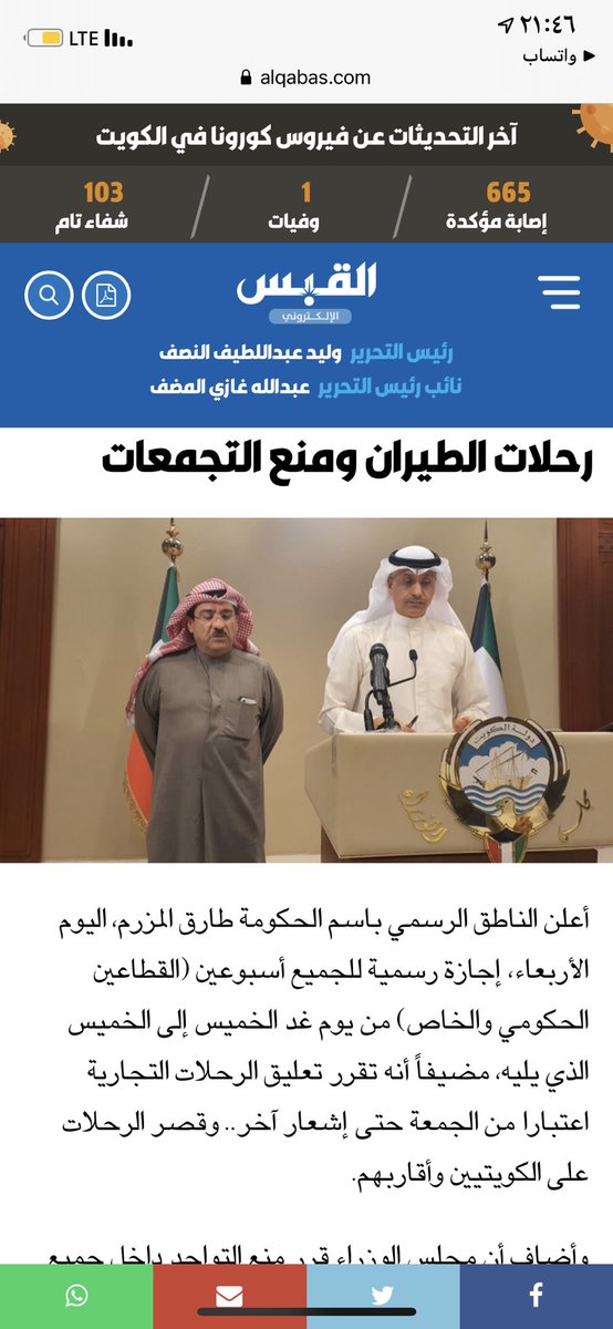 د هشام الصالح בטוויטר بيان قاصر وافدين عن نقاط التفتيش يسألونهم ليش طالع وتم تعطيل وسائل النقل الجماعي والأجرة ومجلس الوزراء يدعو لعدم الخروج الا للضرورة القصوى ويقفل المحلات الافضل قانونا هو