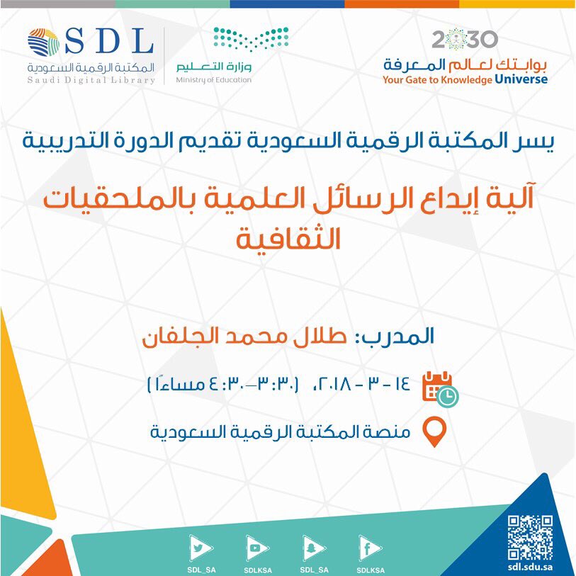 المكتبة الرقمية السعودية Sdl Sur Twitter يحدث الآن تعلن إدارة التدريب والوعي المعلوماتي بـ المكتبة الرقمية السعودية عن بداية دورتين متتاليتين تطبيق عملي لآلية البحث عبر بوابة المكتبة الرقمية السعودية و آلية إيداع الرسائل