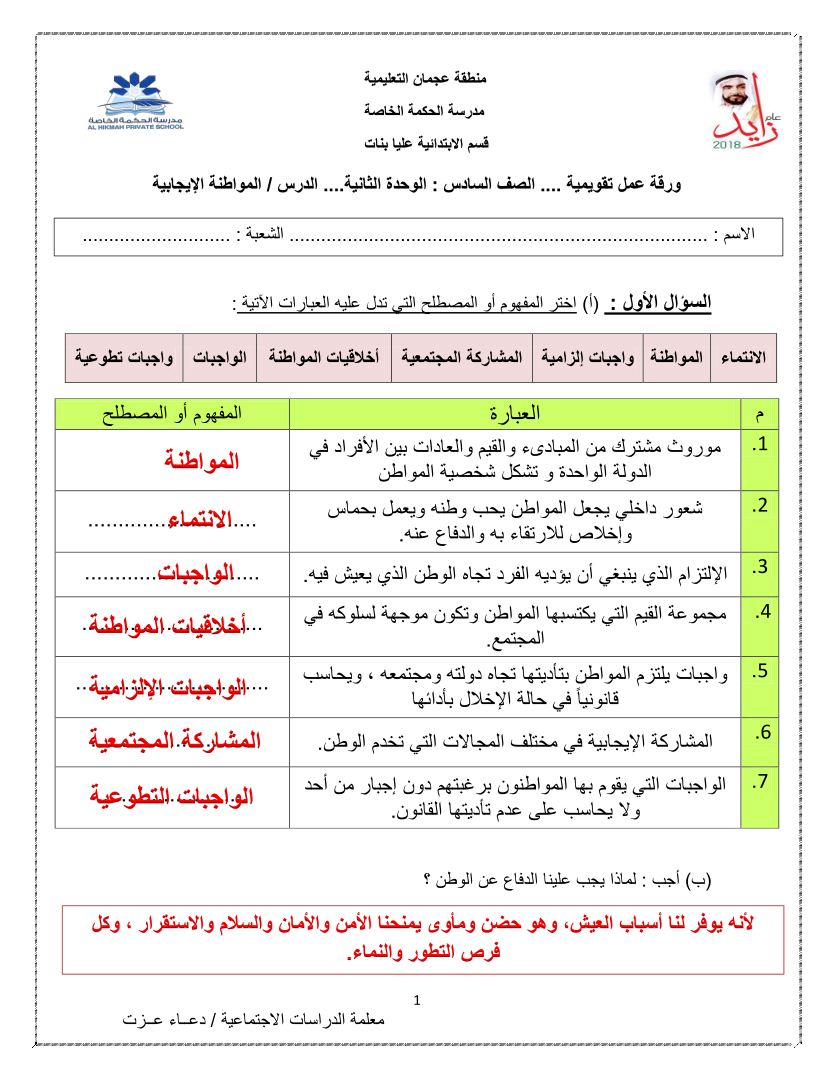 الدراسات الإجتماعية أوراق عمل درس المواطنة الإيجابية للصف السادس مع الإيجابات ملفاتي
