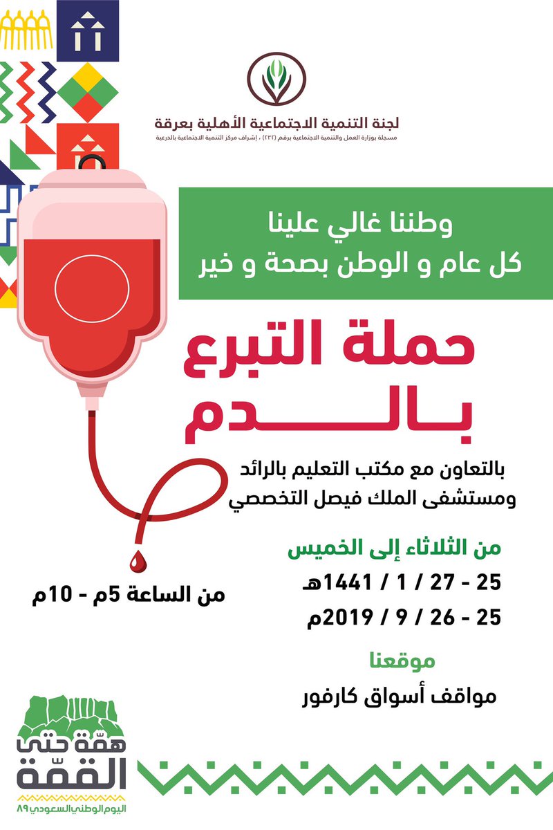 لجنة تنمية عرقة On Twitter بمناسبة اليوم الوطني ٨٩ وتحت شعار همة حتى القمة تنطلق فعاليات حملة التبرع بالدم بالتعاون مع مكتب التعليم بالرائد ومستشفى الملك فيصل التخصصي وطننا غالي علينا فكونوا معنا مقابل