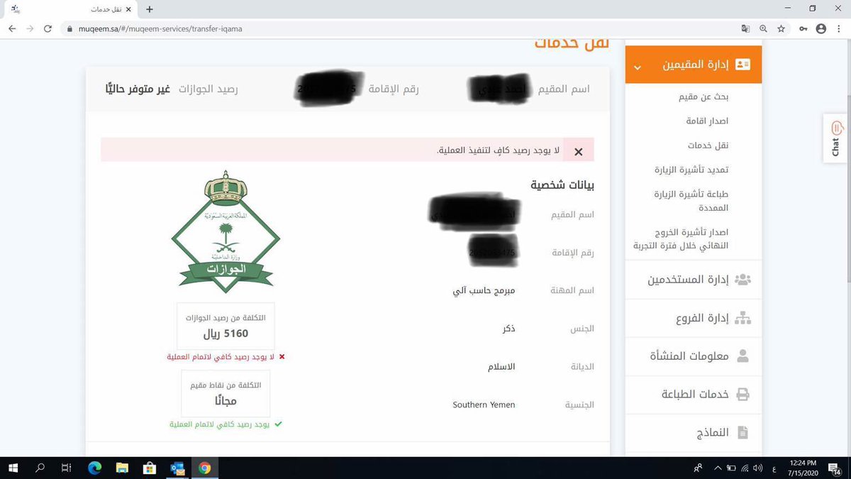 خدماتي الإلكترونية On Twitter نقلت كفالة عامل اقامته منتهية وعنده عائلة وتم سداد رسوم نقل الكفالة واحاول انقله من أبشر يظهر لي ملاحظة الرصيد غير كافي عند نقل خدمة عامل لديه