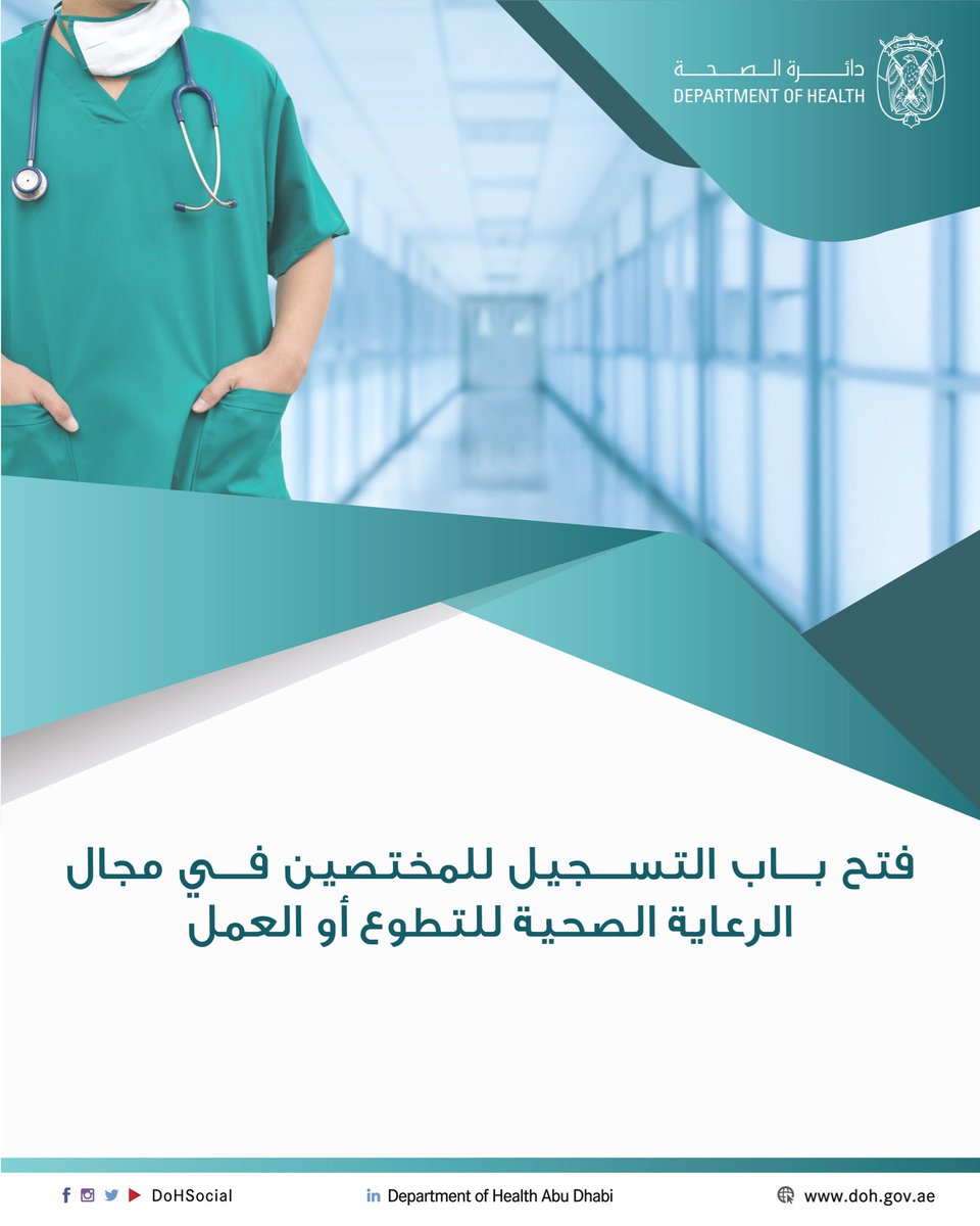 دائرة الصحة أبوظبي No Twitter هل أنت من المختصيين في مجال الرعاية الصحية هل تتوفر لديك أحد هذه الشروط على الأقل وتود التطوع أو العمل في القطاع الصحي في إمارة أبوظبي