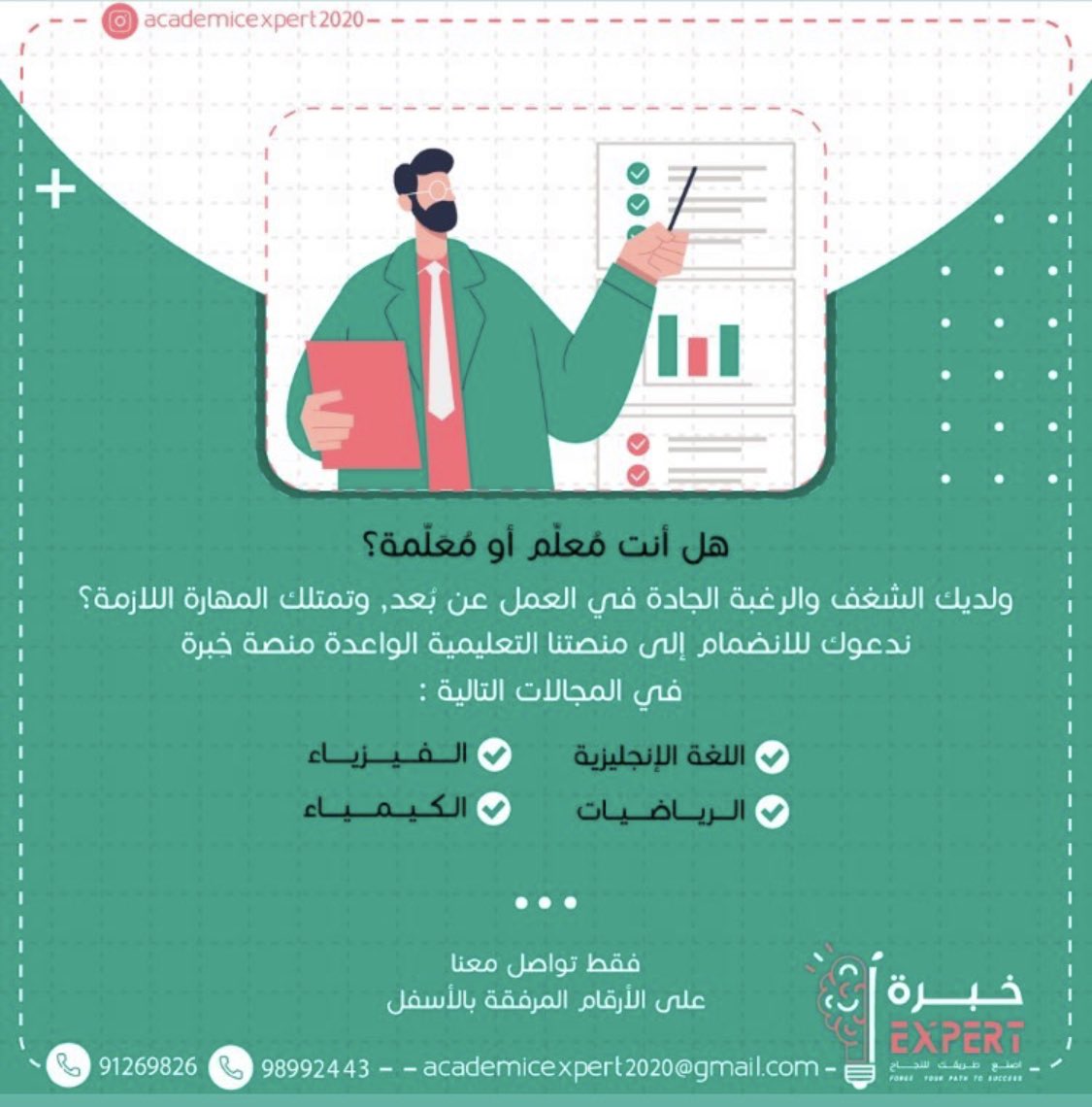 مسار On Twitter معلم أو معلمة ولديك الشغف والعمل الجاد بالعمل عن بعد المنصة التعليمية خبرة تبحث عنك تواصل معهم عبر حسابهم في الإنستجرام أدناه أو عبر الأرقام الموضحة
