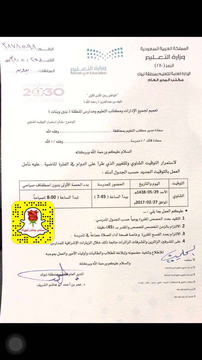 سناب بنات تبوك A Twitter عاجل تعميم الى جميع الإدارات والمدارس بمنطقة تبوك توقيت جديدللحضور للمدارس من الساعه 7 45 دقيقه من يوم الاحد ضباء الوجه املج تيماء Https T Co 8nsbfbl6su