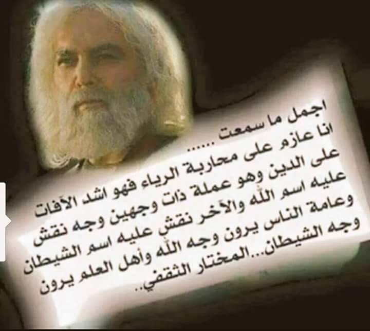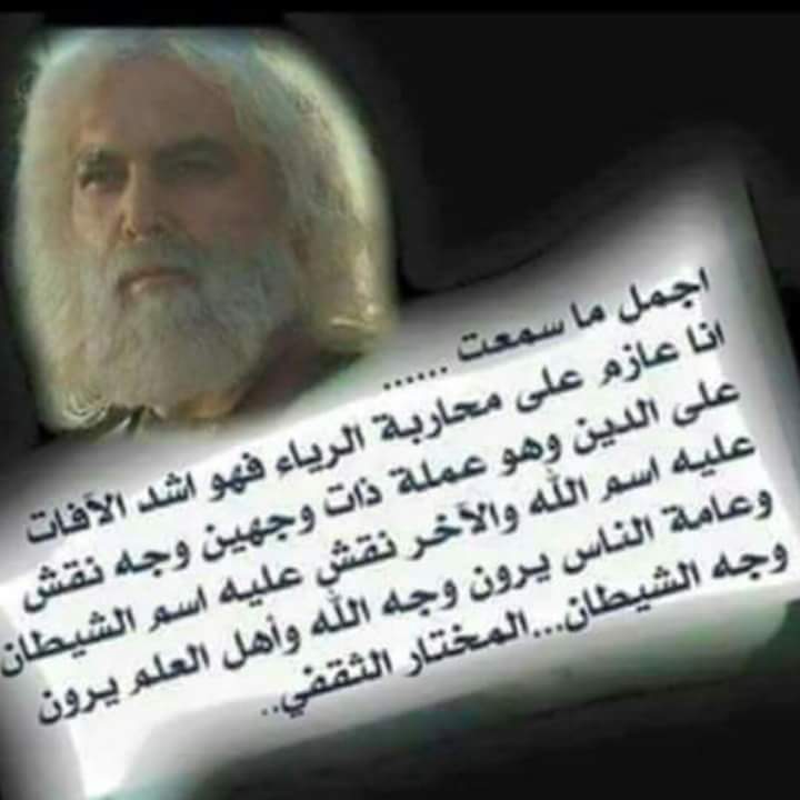 من اقوال المختار الثقفي رضوان الله عليه انتبهو الرياء فهو من اشد الافات لأن الرياء يدخل الميدان بلباس الدين والتقوى هو عملة ذات وجهين وجها نقش عليه اسم الله والاخر نقش
