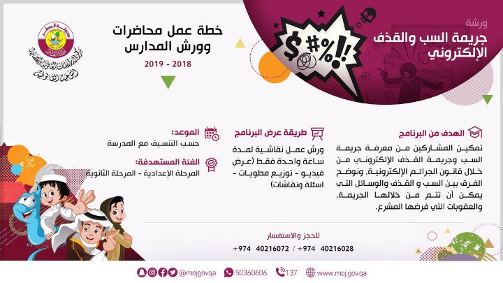 الراية القطرية Twitterren وزارة العدل ورشة عمل بعنوان جريمة السب والقذف الإلكتروني لتمكين طلبة المدارس من معرفة الفرق بين السب والقذف والوسائل التي يمكن أن تتم من خلالها الجريمة والعقوبات التي فرضها