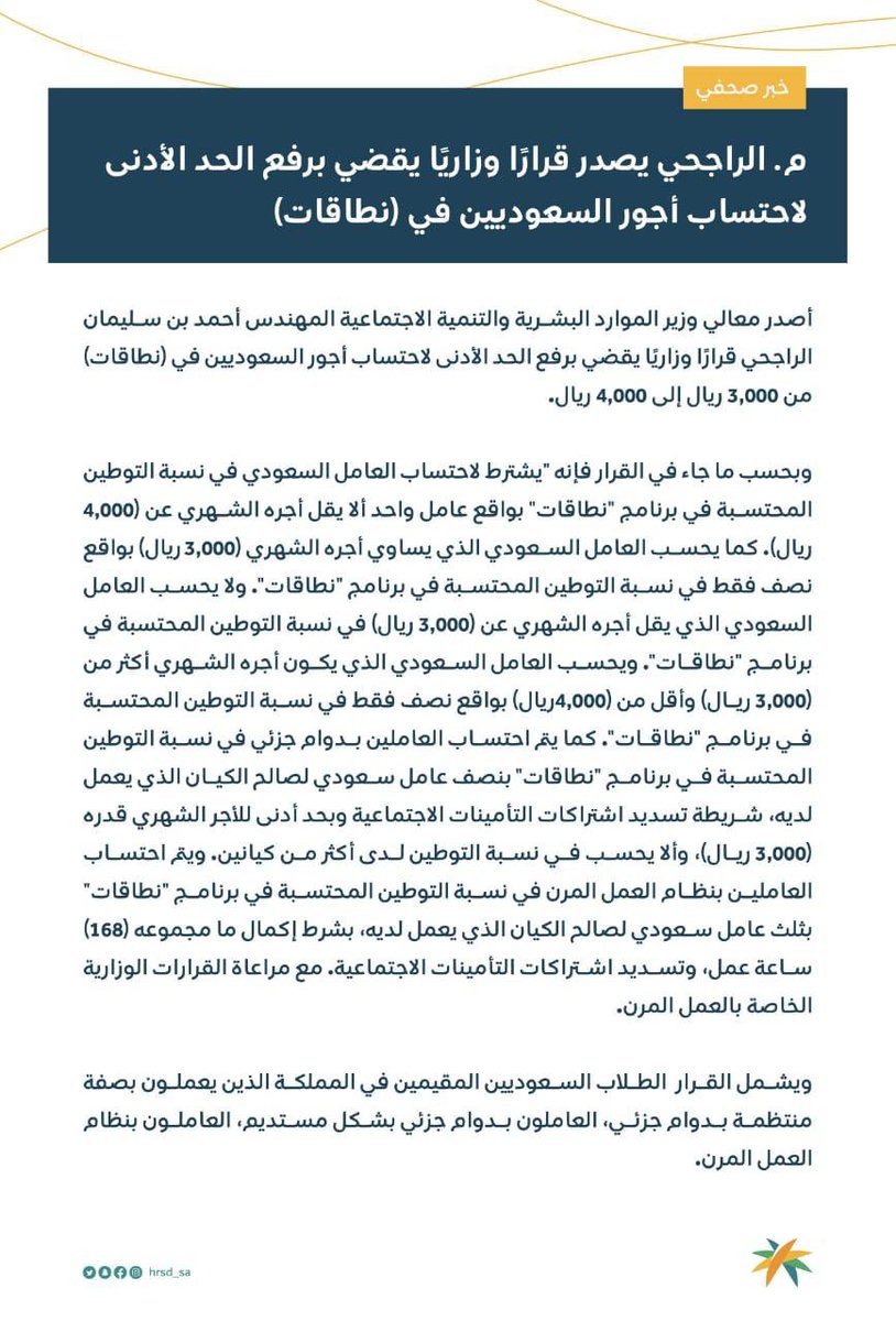 شرح نظام العمل السعودي On Twitter صدر قرار وزير العمل برفع الحل الادنى لاحتساب السعودي في التوطين ١ يعتبر ٤٠٠٠ سعودي كامل و٣٠٠٠ نصف سعودي ٢ يشمل اساسي سكن عمولات ولا يدخل فيها