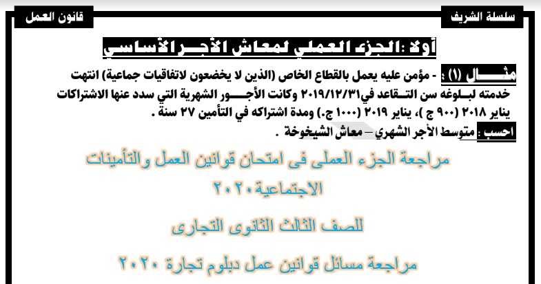 مراجعة الجزء العملى فى امتحان قوانين العمل والتأمينات الاجتماعية للصف الثالث الثانوى التجارى 2020 مراجعة مسائل قوانين عمل دبلوم تجارة 2020