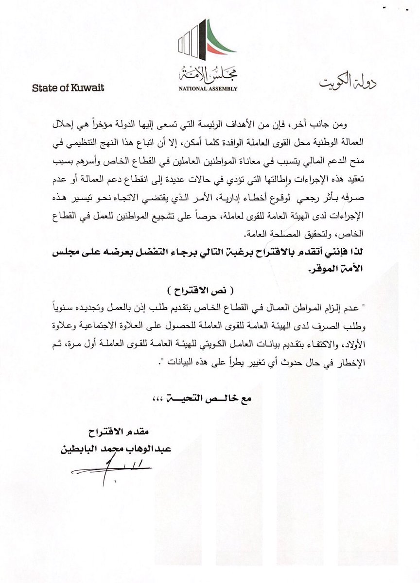 صوتكم در توییتر إلغاء إذن العمل عن الكويتيين العاملين في القطاع الخاص تقدم النائب البابطين باقتراح بإلغاء إذن العمل للكويتيين والاكتفاء بالبيانات المقدمة للهيئة العامة للقوى العاملة لأول مرة والاخطار في حال
