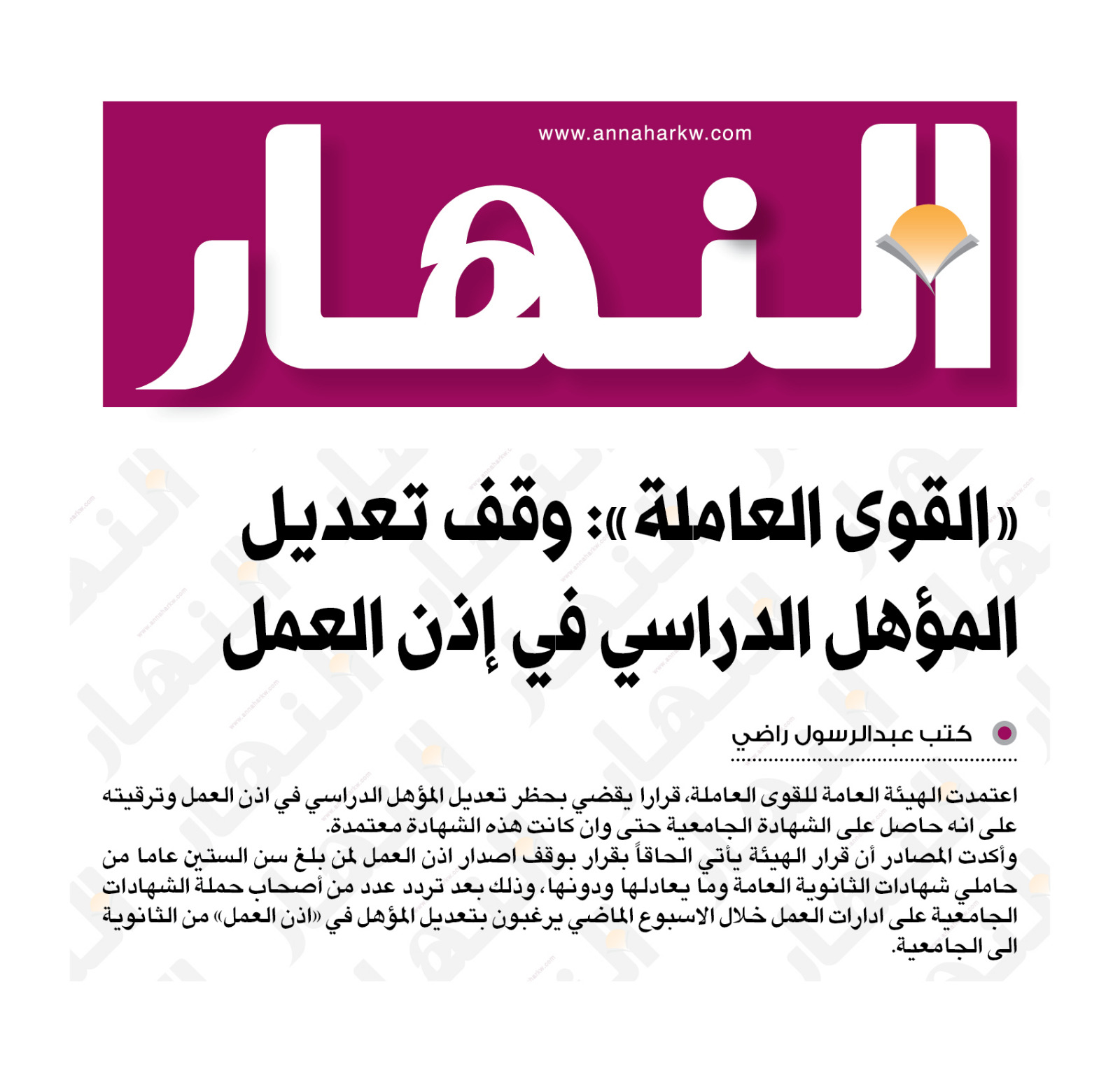 جريدة النهار الكويتية القوى العاملة وقف تعديل المؤهل الدراسي في إذن العمل
