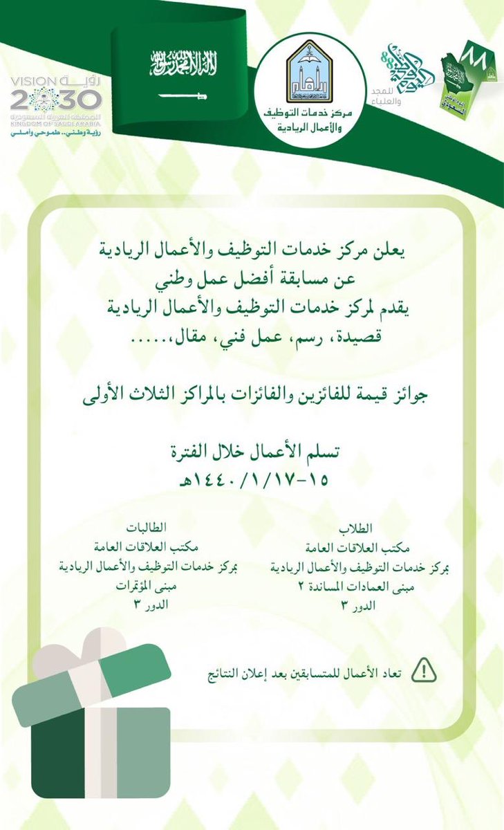 عمادة الابتكار وريادة الأعمال On Twitter يعلن مركز خدمات التوظيف والأعمال الريادية عن مسابقته الوطنية تزامنا مع ذكرى اليوم الوطني88 مسابقة أفضل عمل وطني يقدم لمركز خدمات التوظيف والأعمال الريادية قصيدة رسم عمل فني مقال