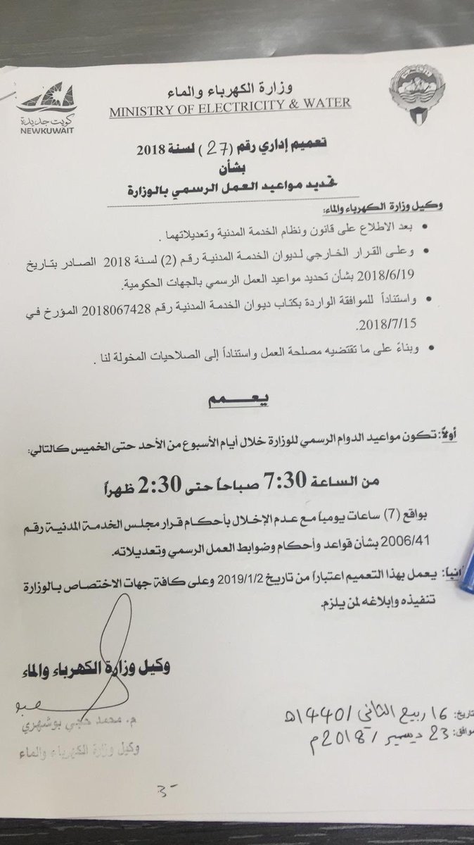 مزيد المطيري Na Tviteru تعميم إداري رقم 27 لسنة 2018 مواعيد العمل الرسمي بوزارة الكهرباء والماء من تاريخ 2019 1 2 غدا الأربعاء من الساعة 7 30 صباحا إلى الساعة 2 30 ظهرا قرار غير